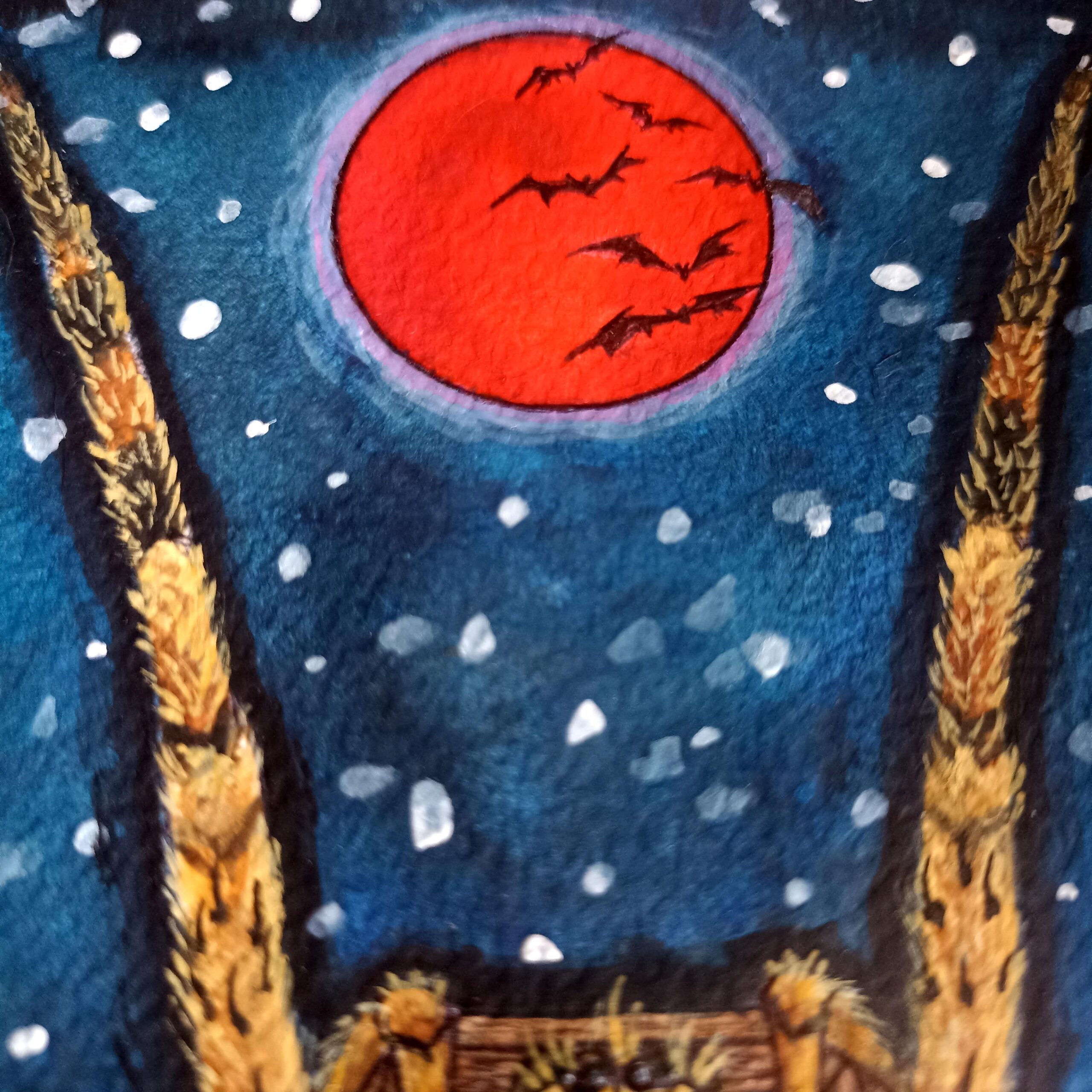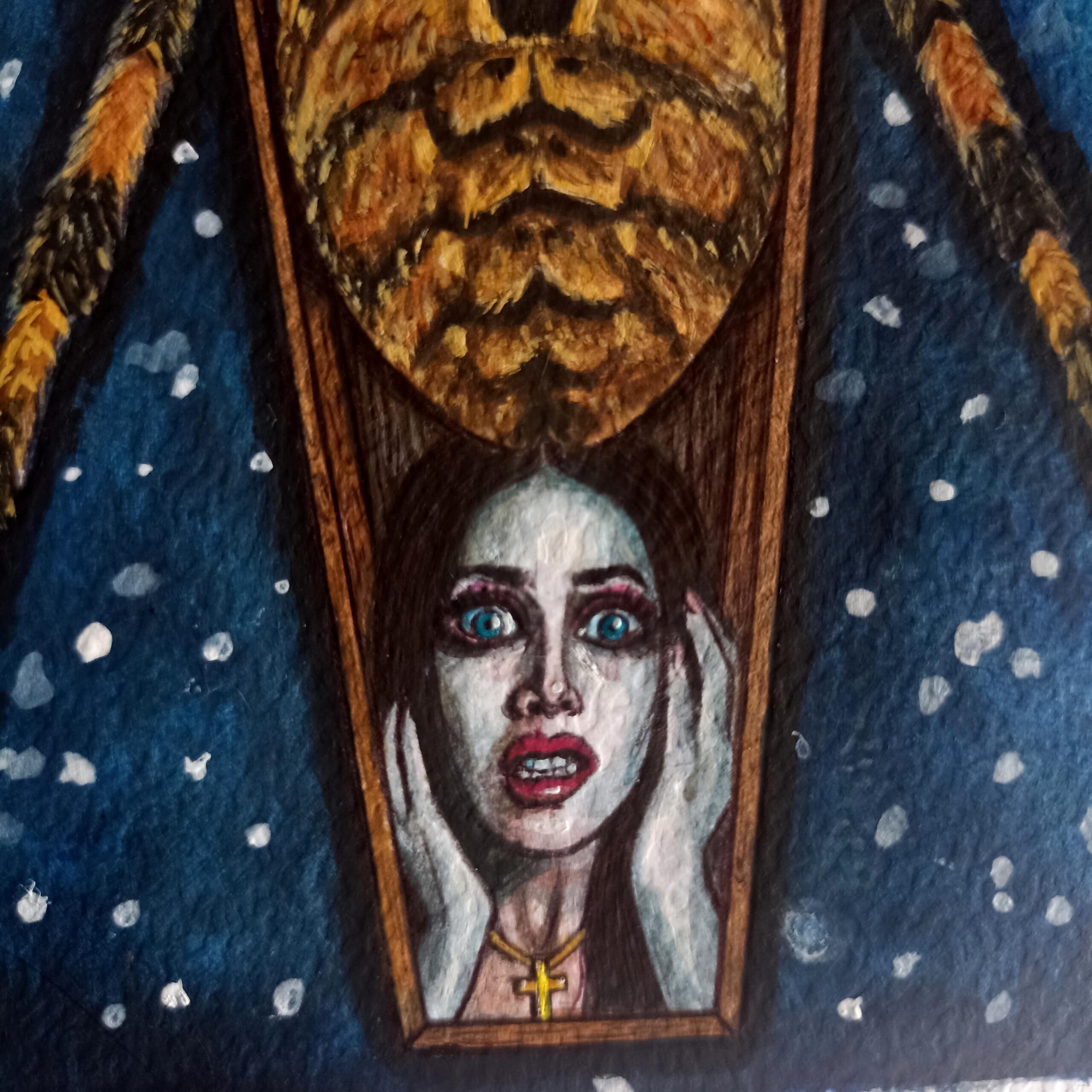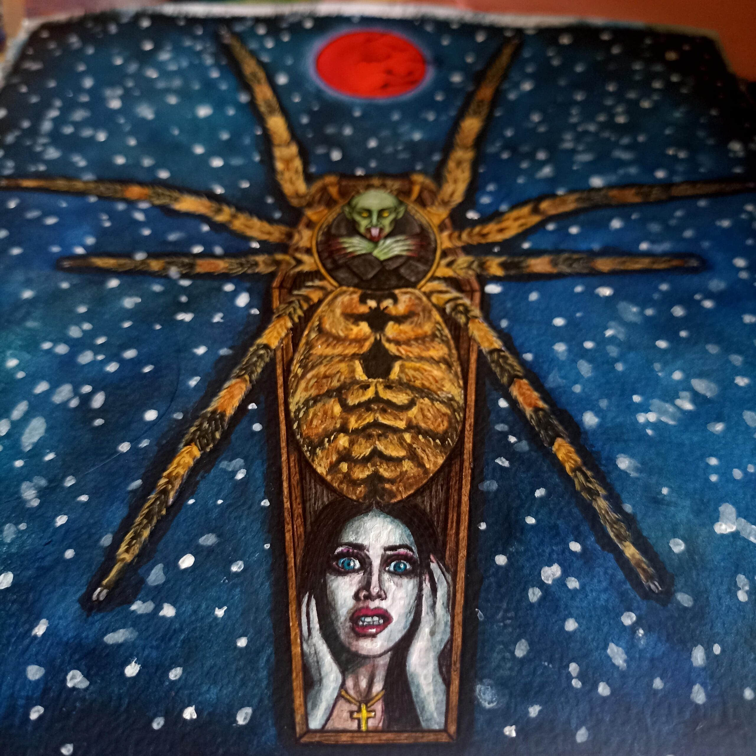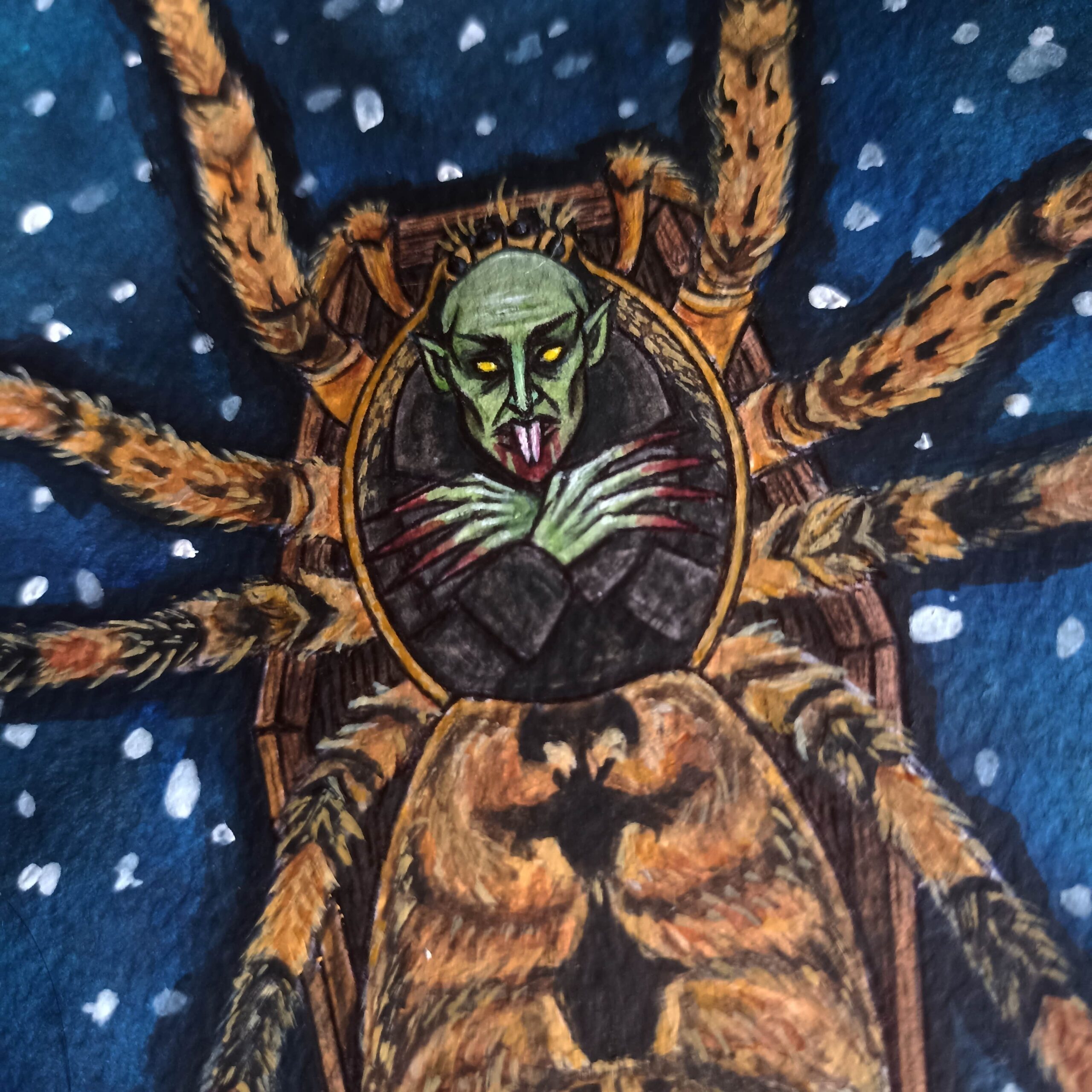 Noxrenatu – Du latin nox : nuit, et renatus : né de nouveau. Cette œuvre représente une araignée de l’espèce Zoropsis spinimana, également appelée « araignée Nosferatu », sur laquelle semble figurer le vampire éponyme. Elle symbolise l’avènement de Nosferatu le 25 Décembre, la nuit comme muse et remède contre le deuil et l’angoisse de la mort, et la renaissance dans les ténèbres.